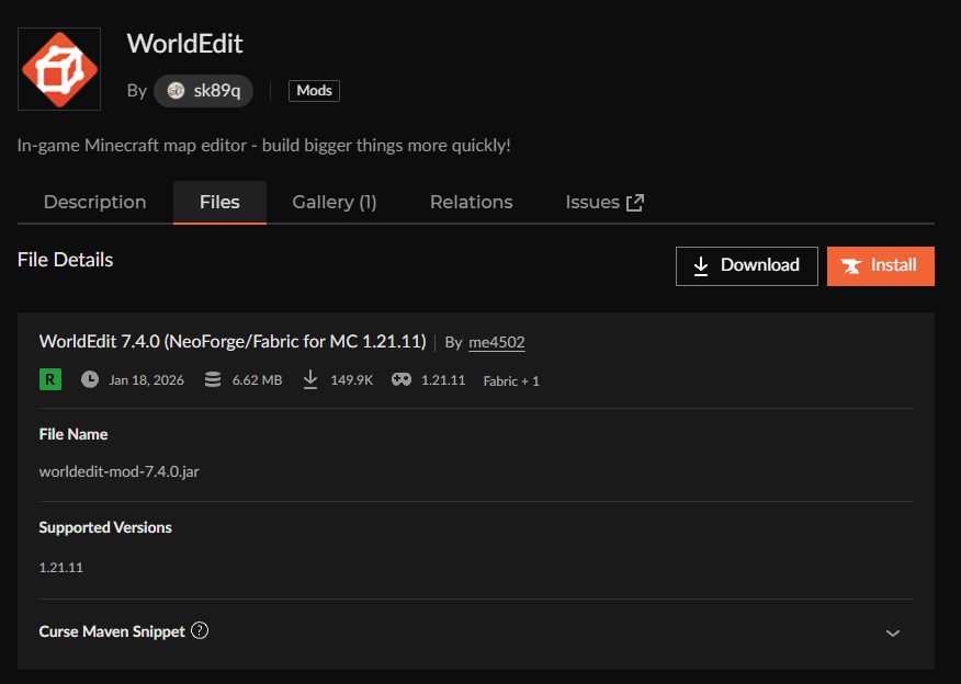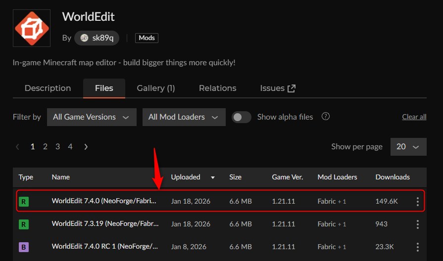 CurseForgeの「WorldEdit」ページにアクセスして、バージョンを選択します。(ここでは1.21.11を選びます)