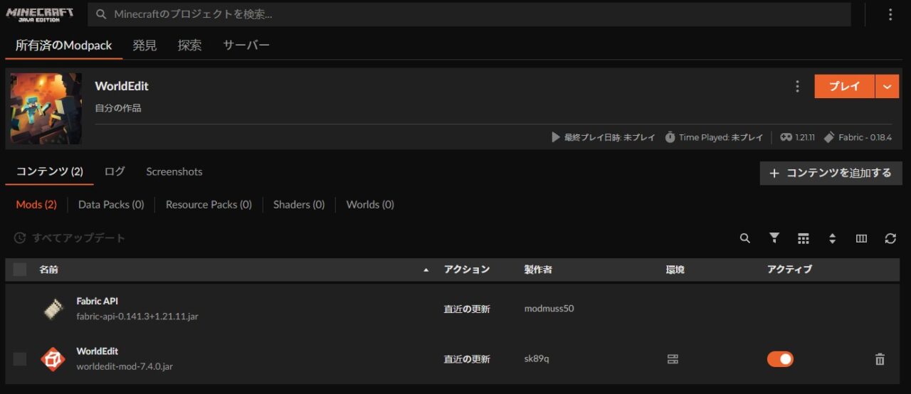 「プレイ」をクリックしてランチャーを起動。ワールドに入った際、チャット欄で 「//wand」 と入力し「木の斧」がインベントリに追加されれば導入完了です。