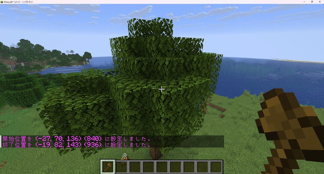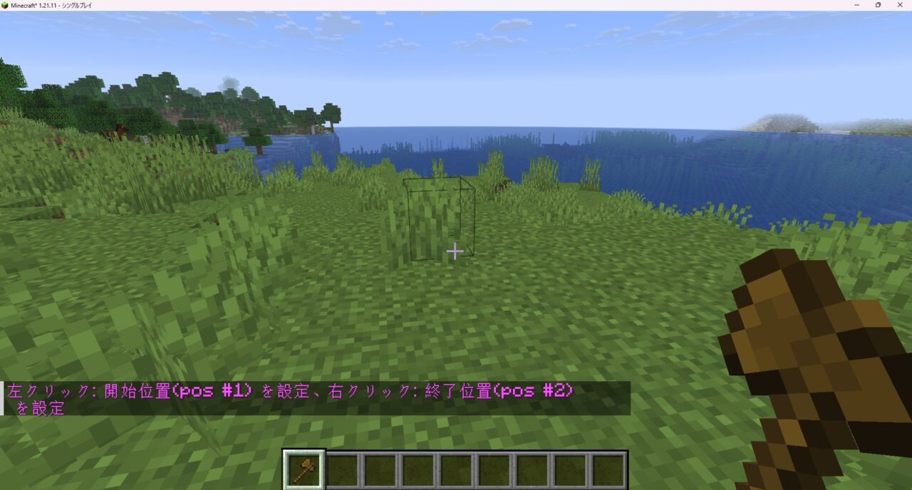 「木の斧」を手に持ち、左クリックと右クリックで範囲の始点と終点を指定します。