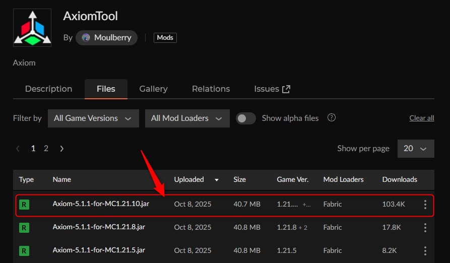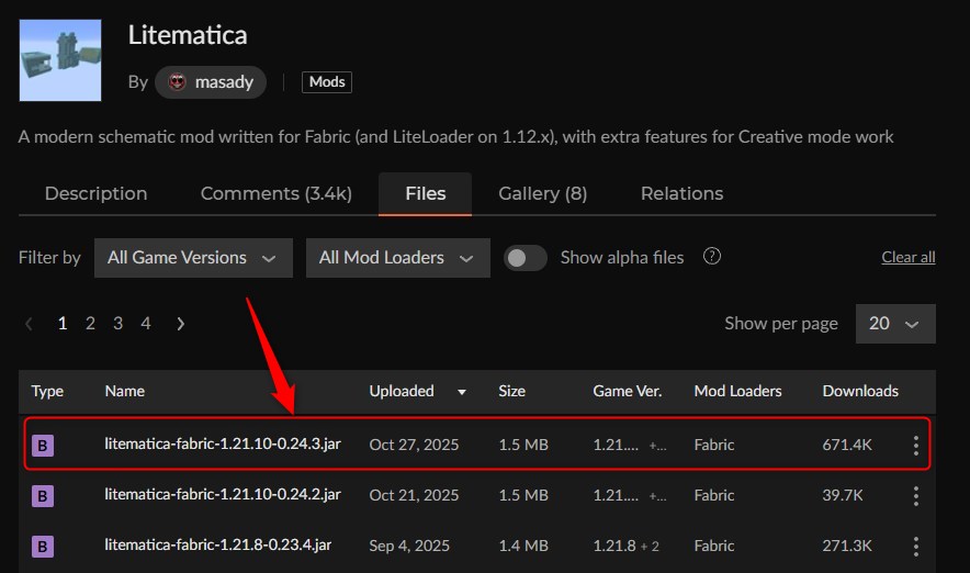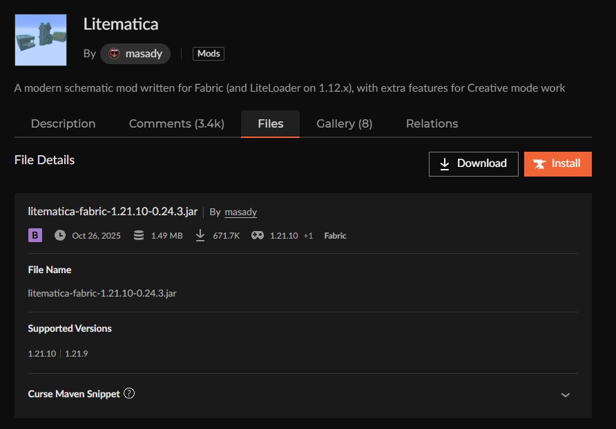 CurseForgeの「Litematica」ページにアクセスして、バージョンを選択します。(ここではバージョン1.21.10を選びます)