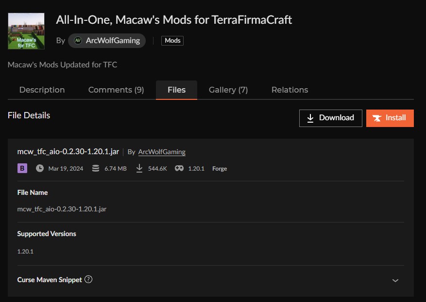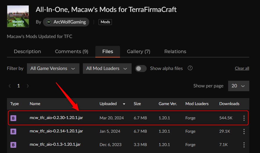 「All-In-One, Macaw’s Mods for TerraFirmaCraft」にアクセスして、バージョンを選択します。(ここではバージョン1.20.1を選びます)
