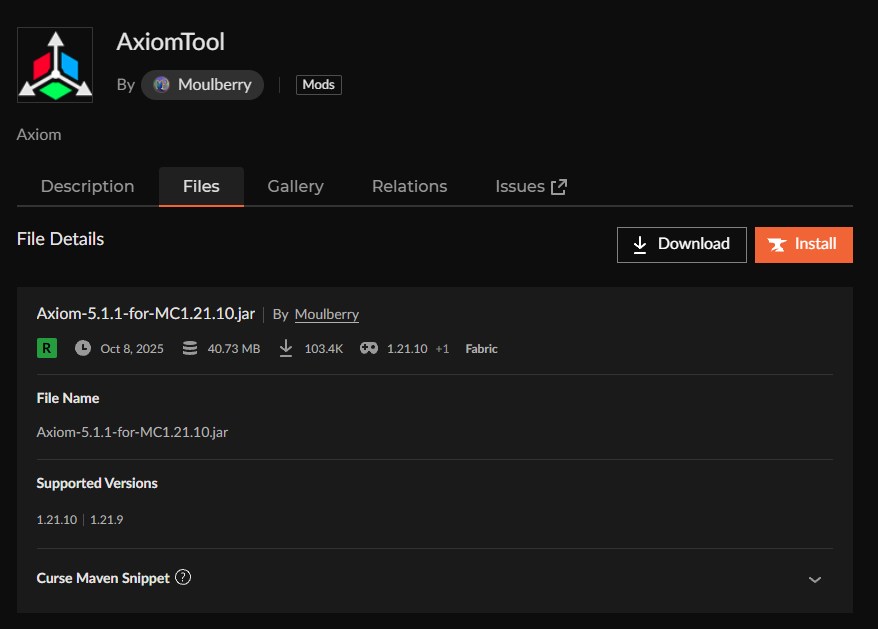 | 4:AxiomTool | ・次世代の最強建築ツール。3Dモデリングソフトのように直感操作 ・地形生成や複雑な現代建築も一瞬で作成可能 | 1.20~1.21.10 |