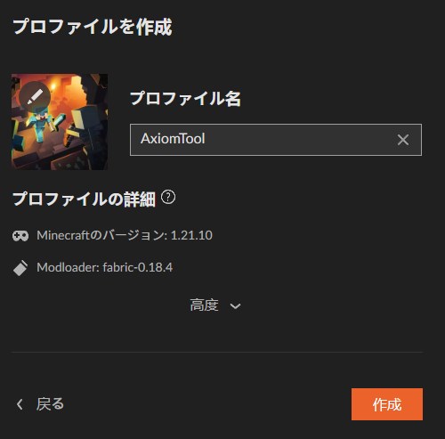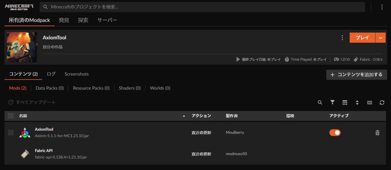 「プレイ」をクリックしてランチャーを起動。クリエイティブモードでワールドに入り、右シフトキー(Right Shift)を押してAxiomの専用エディタ画面が開けば導入完了です。