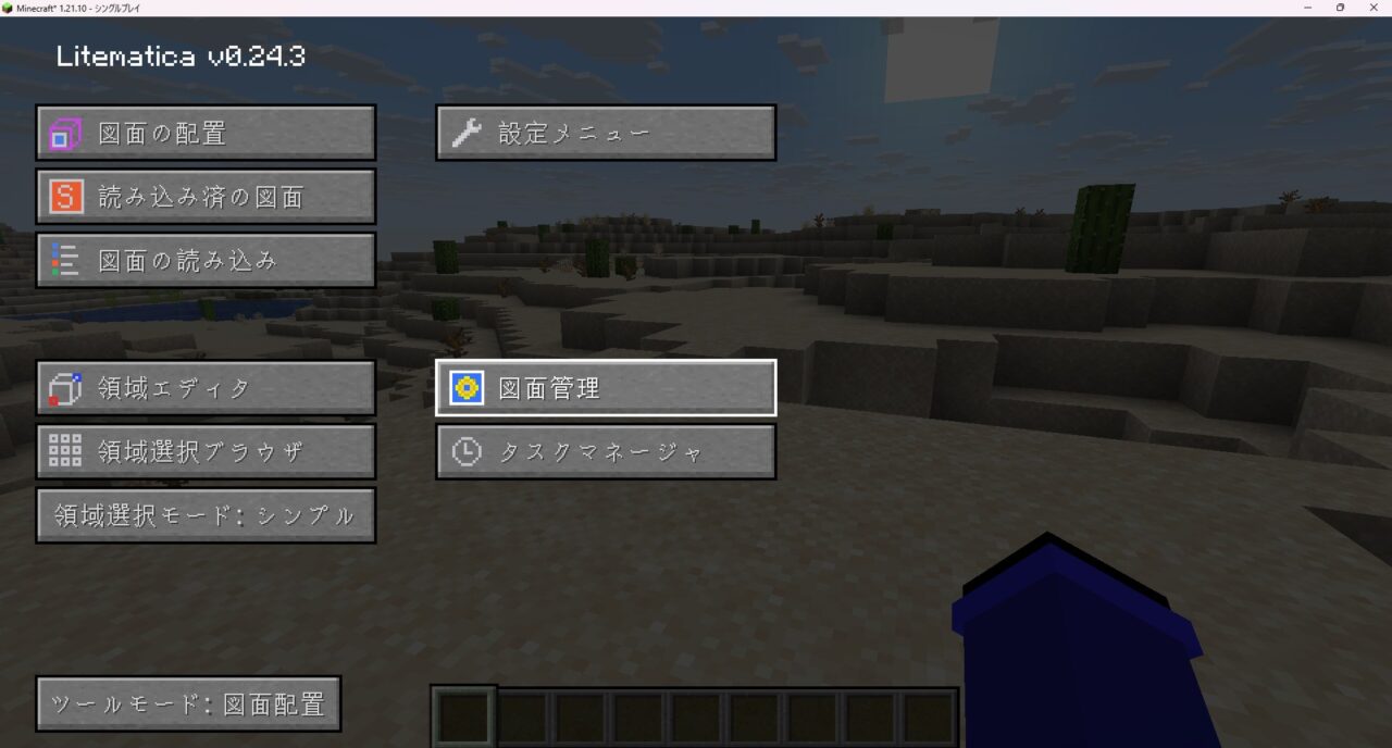| 2:Litematica | ・設計図(ホログラム)を表示して建築をサポート ・素材リストの確認や自動建築機能の活用が可能 | 1.13.2~1.21.10 |