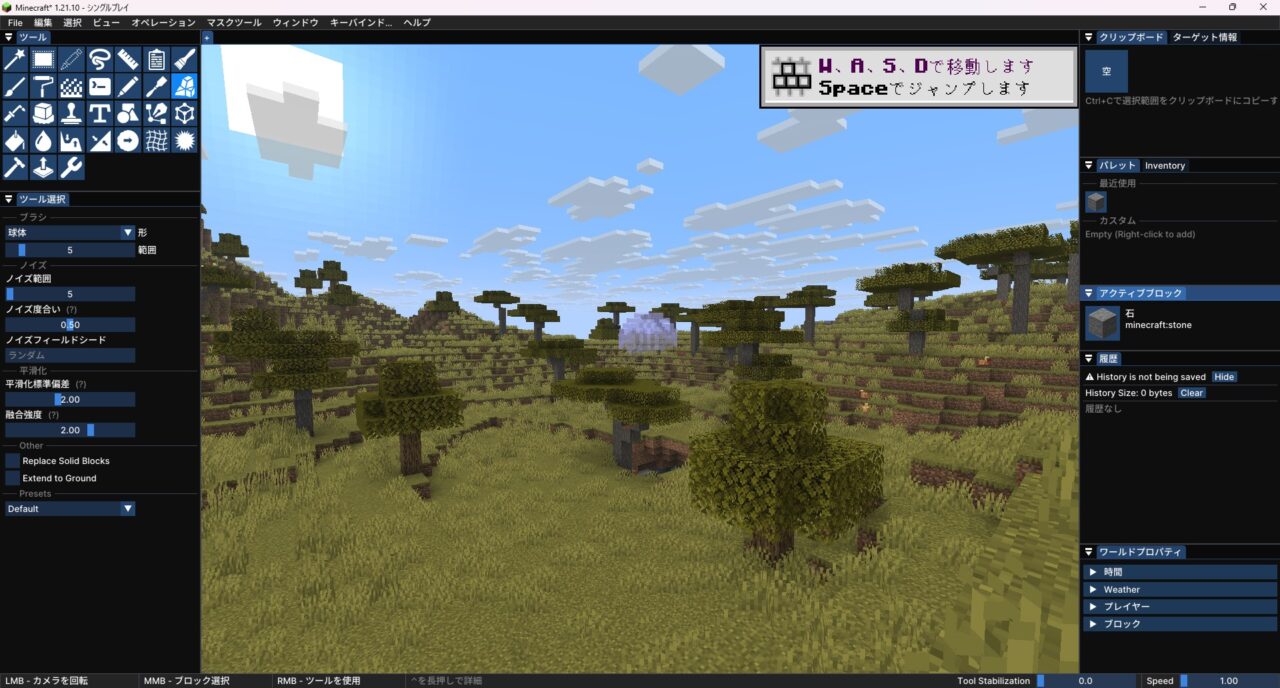 広大な土地の整地や、巨大な球体・円柱の作成、建物のコピー&ペーストなどを魔法のように一瞬で行えるのが特徴です。