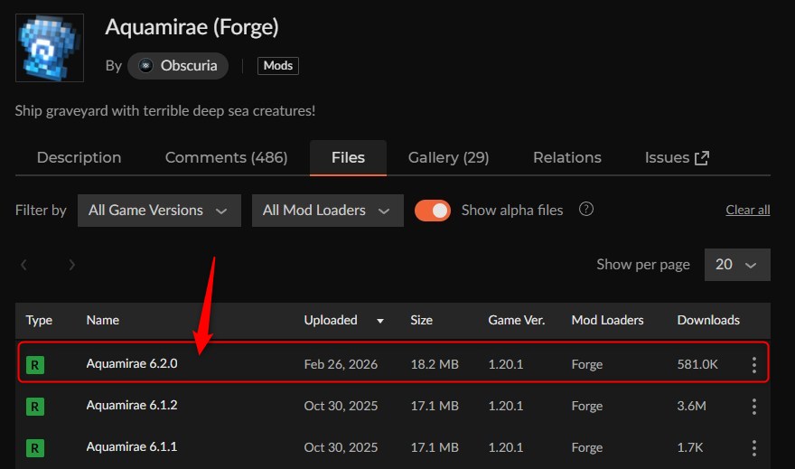 CurseForgeの「Aquamirae (Forge)」または「Aquamirae (Fabric)」ページにアクセスして、バージョンを選択します。※ここでは「Aquamirae (Forge)」で解説します。