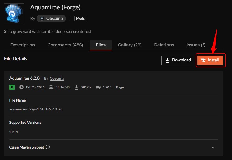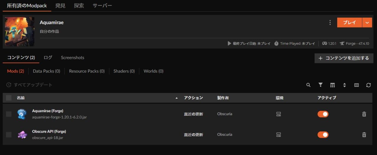 ※動作に必要なMODは自動でインストールされます。Forgeを使う場合は「Aquamirae (Forge)」を、Fabricを使う場合は「Aquamirae (Fabric)」ページからダウンロードしてください。