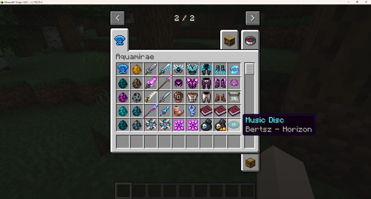マイクラを起動し、クリエイティブモードでアイテム一覧にAquamiraeの武器・防具・アングラーフィッシュのスポーンエッグなどが追加されていれば導入完了です。
