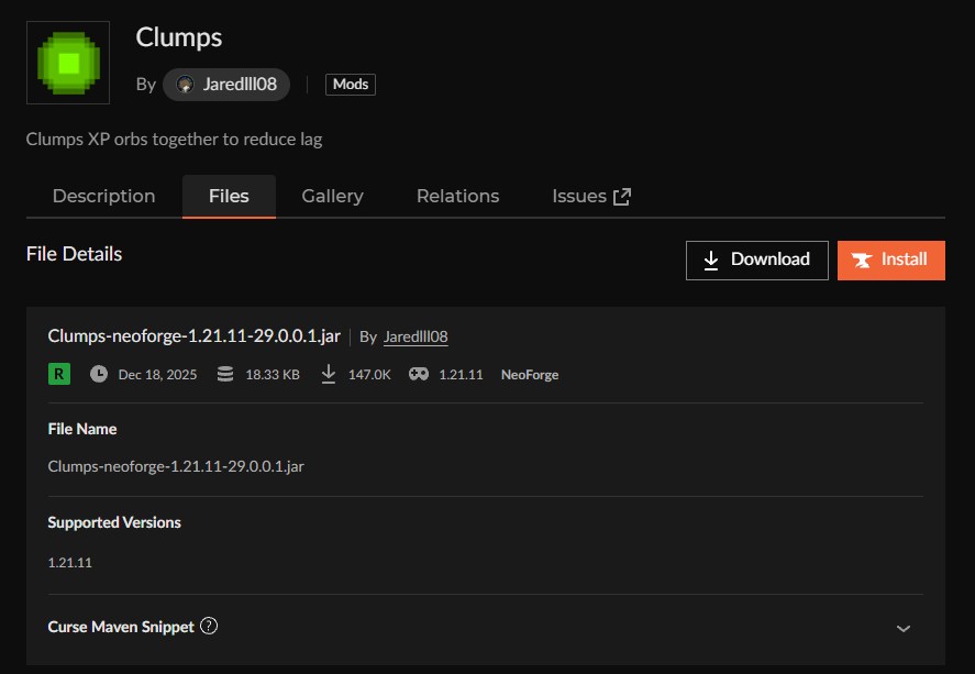 | 1:Clumps | ・XP玉を1つにまとめてラグを削減し、触れると即座に吸収する軽量化・快適化MOD ・約3億2,000万DLを誇るCurseForge最多人気の経験値MOD | 1.10.2~1.21.11 |