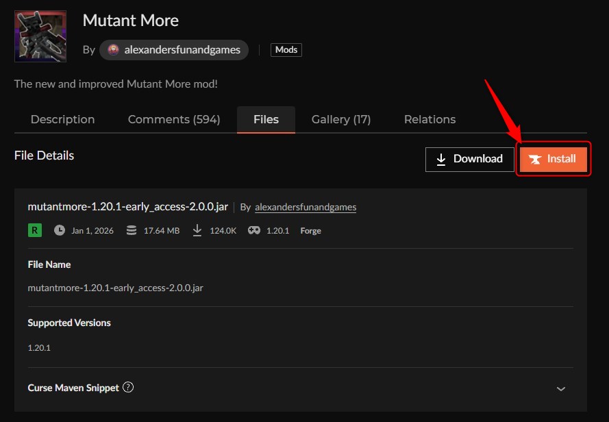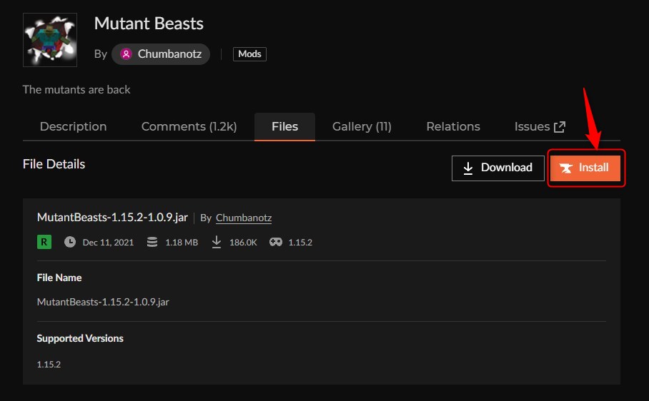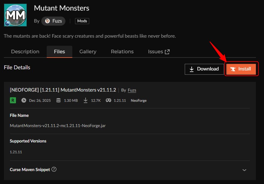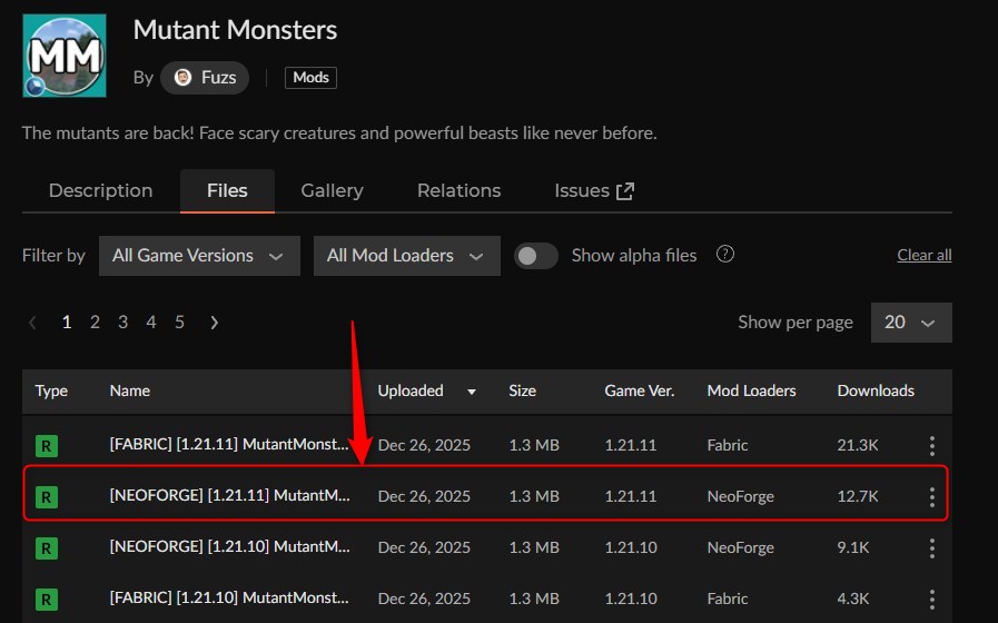 「Mutant Monsters」にアクセスして、「Mutant Monsters」のバージョンを選択します。(ここでは1.21.11を選びます)