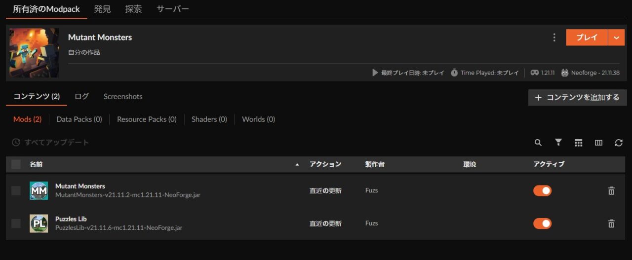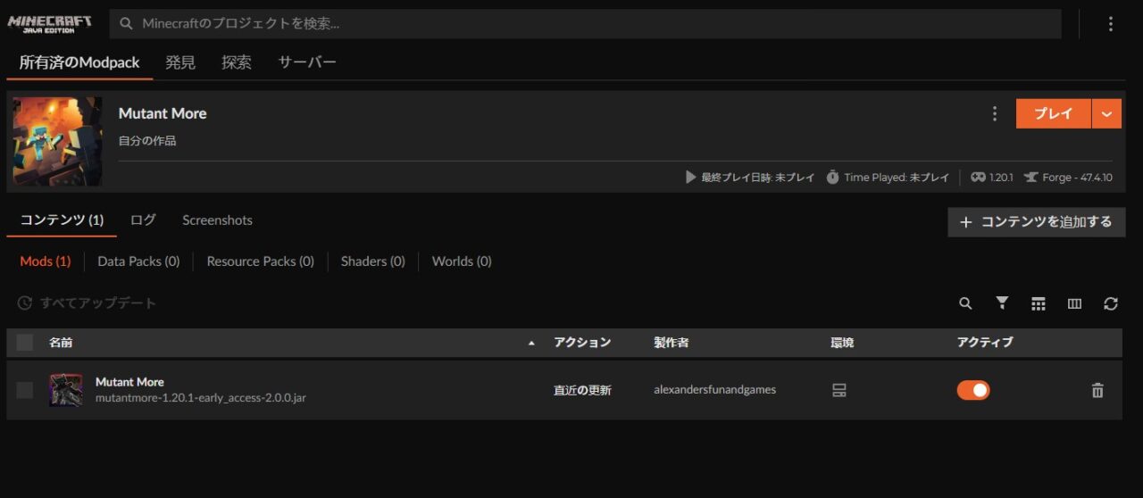 「プレイ」をクリックしてランチャーを起動。マイクラのMOD欄に「Mutant Monsters」があるか確認しましょう。
