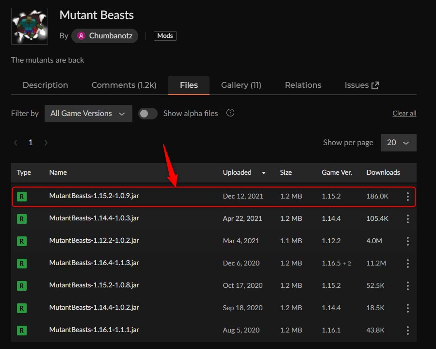 「Mutant Beasts」にアクセスして、バージョンを選択します。(ここではバージョン1.16.5を選びます)