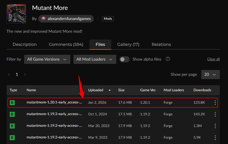 「Mutant More」にアクセスして、「Mutant More」のバージョンを選択します。(ここではバージョン1.20.1を選びます)