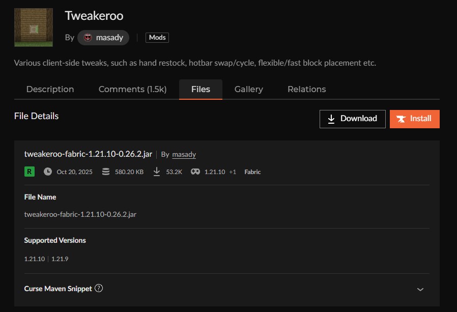 「Tweakeroo」にアクセスして、「Tweakeroo」のバージョンを選択します。(ここでは1.21.10を選びます)