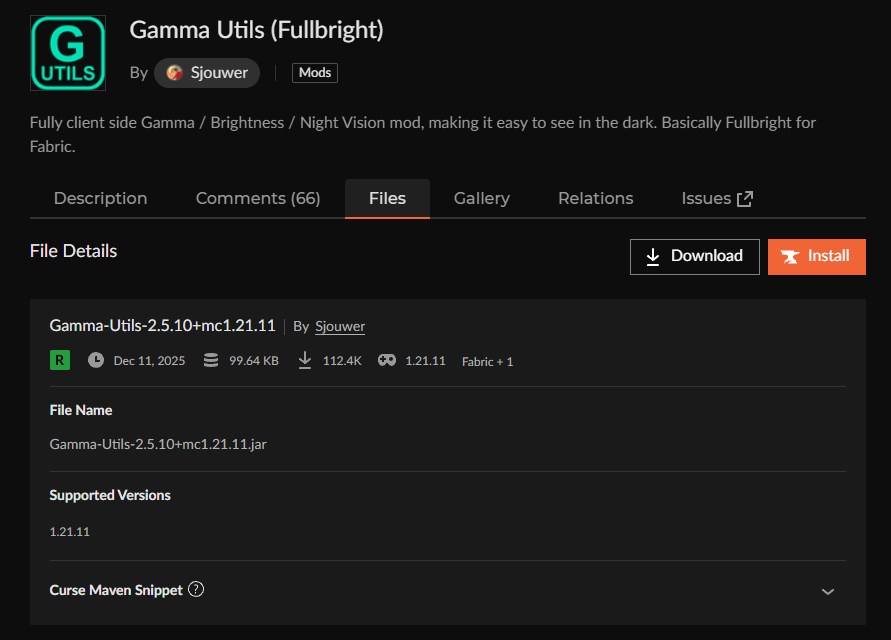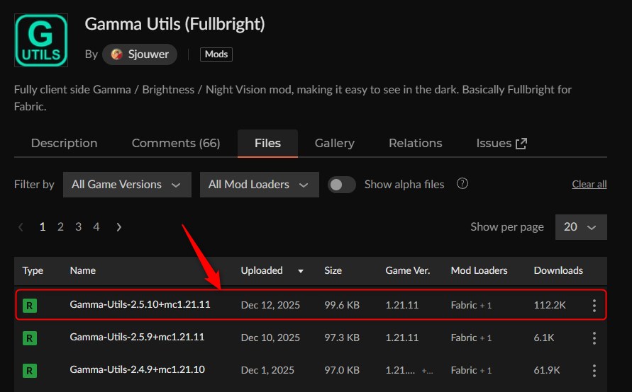 「Full Brightness Toggle」にアクセスして、「Full Brightness Toggle」のバージョンを選択します。(ここではバージョン1.21.11を選びます)