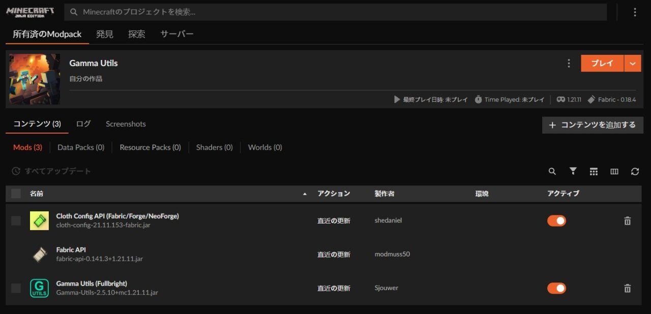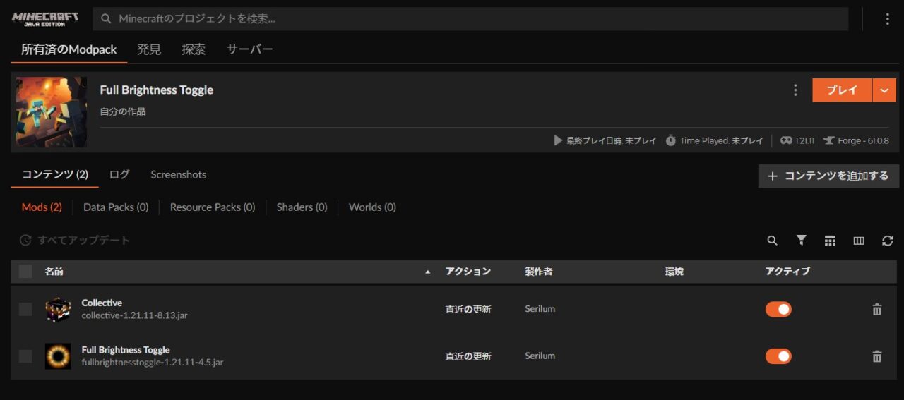 「プレイ」をクリックしてランチャーを起動。マイクラのMOD欄に「Full Brightness Toggle」があるか確認しましょう。
