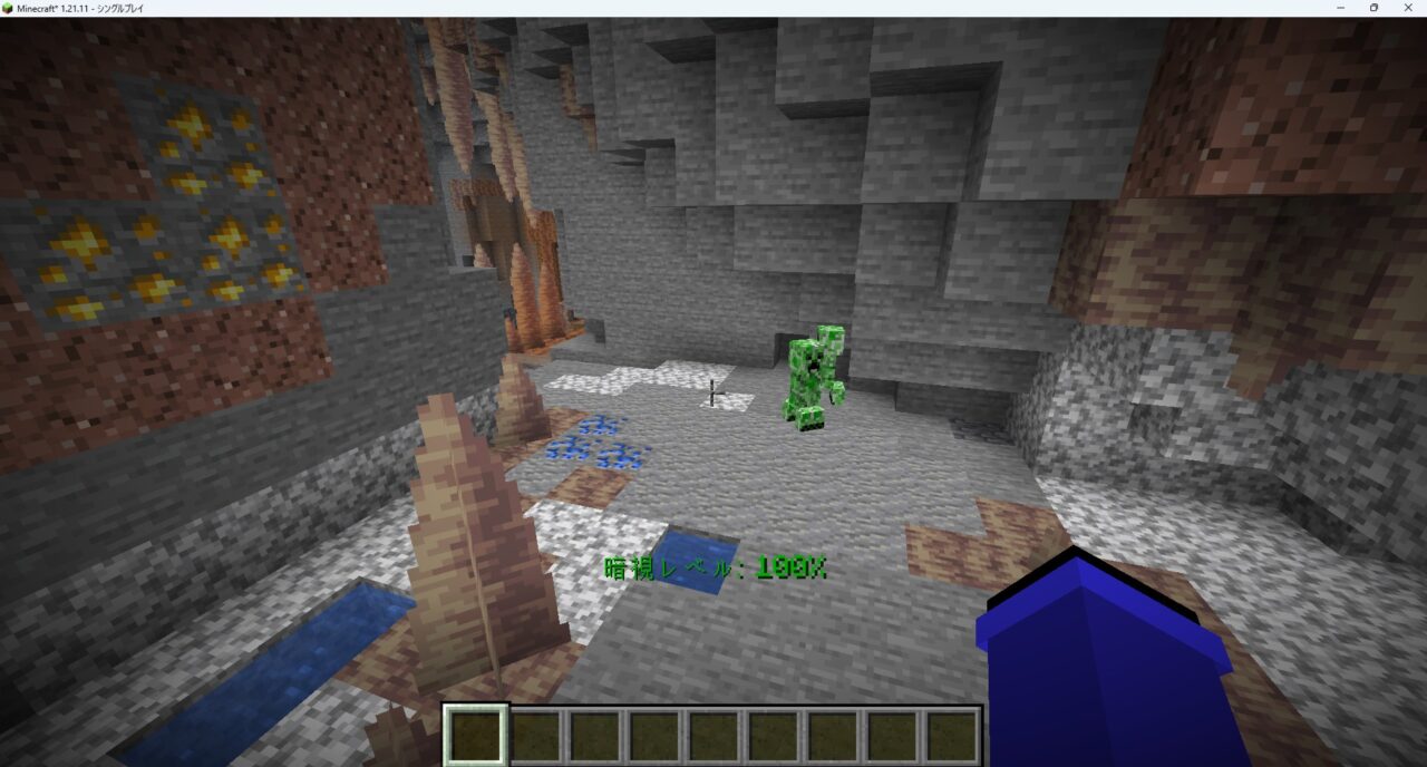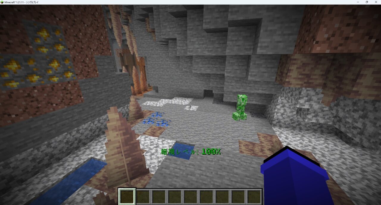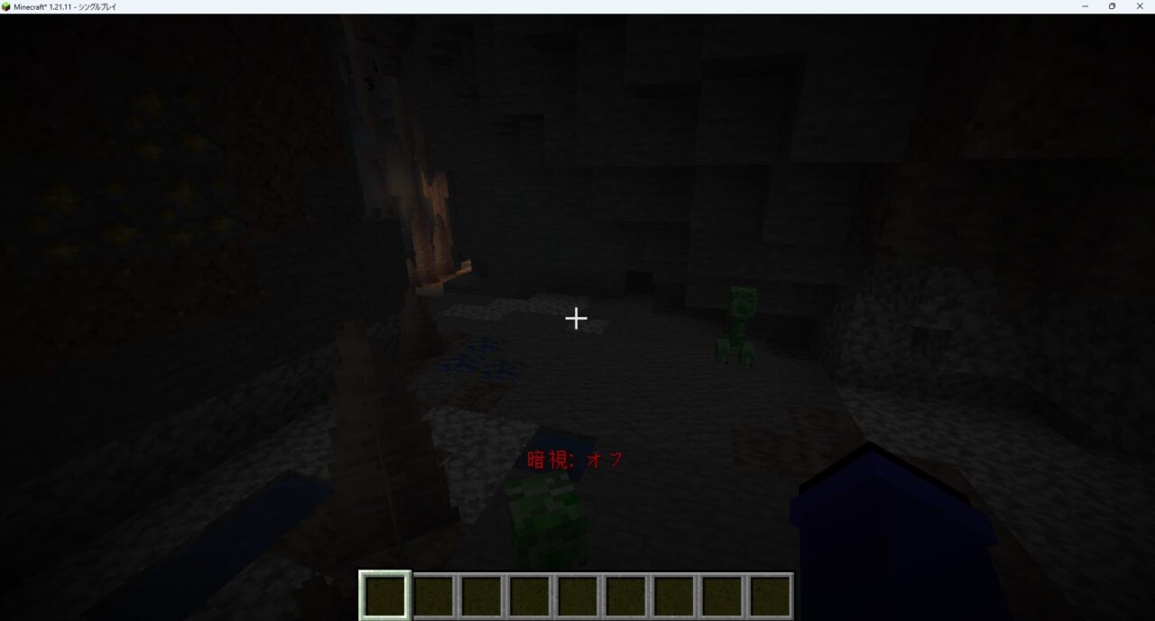 「マイクラ暗視mod」を導入すれば、松明切れの心配や、画面が暗すぎて見えないストレスから解放されます。