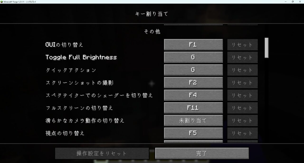 「G」キーを変更したいときは、「設定」→「操作設定」→「キーの割り当て」で「Full Brightness Toggle」の項目で変更します。