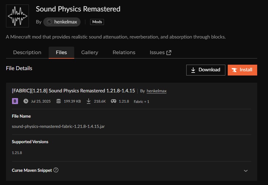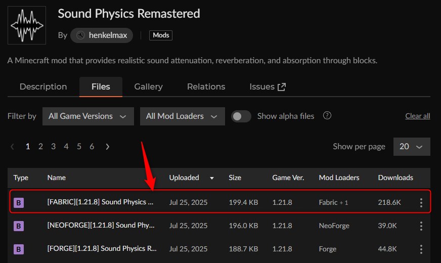 CurseForgeの「Sound Physics Remastered」ページにアクセスして、バージョンを選択します。