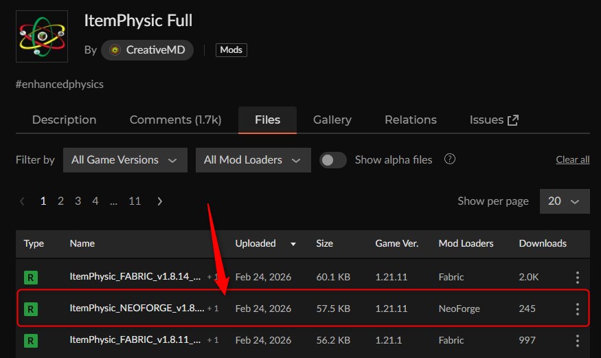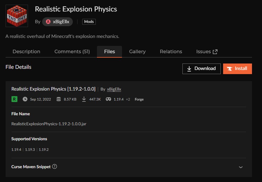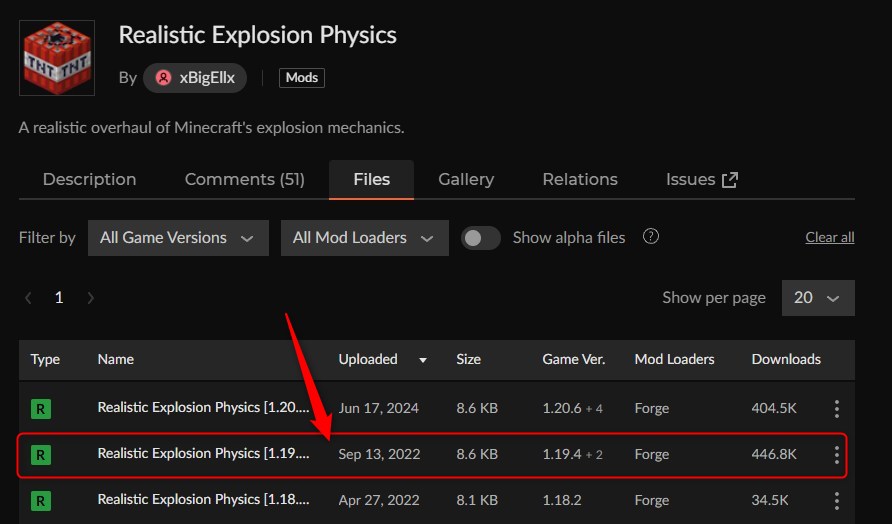 CurseForgeの「Realistic Explosion Physics」ページにアクセスして、バージョンを選択します。
