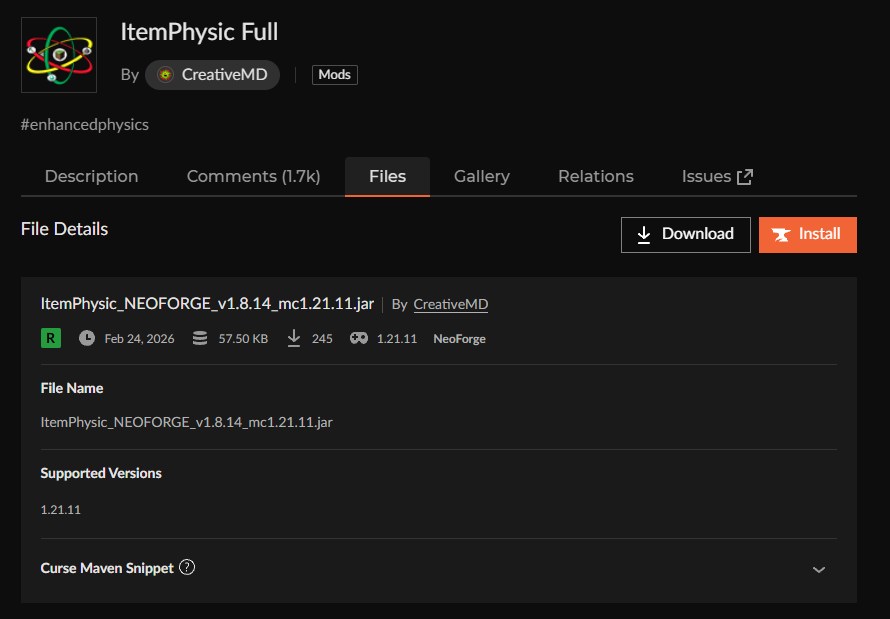 CurseForgeでの累計ダウンロード数が約1億を超える、マイクラ物理演算MODの中でも圧倒的な人気を誇る定番中の定番で、1.20.1や1.21.1など幅広いバージョンで動作します。
