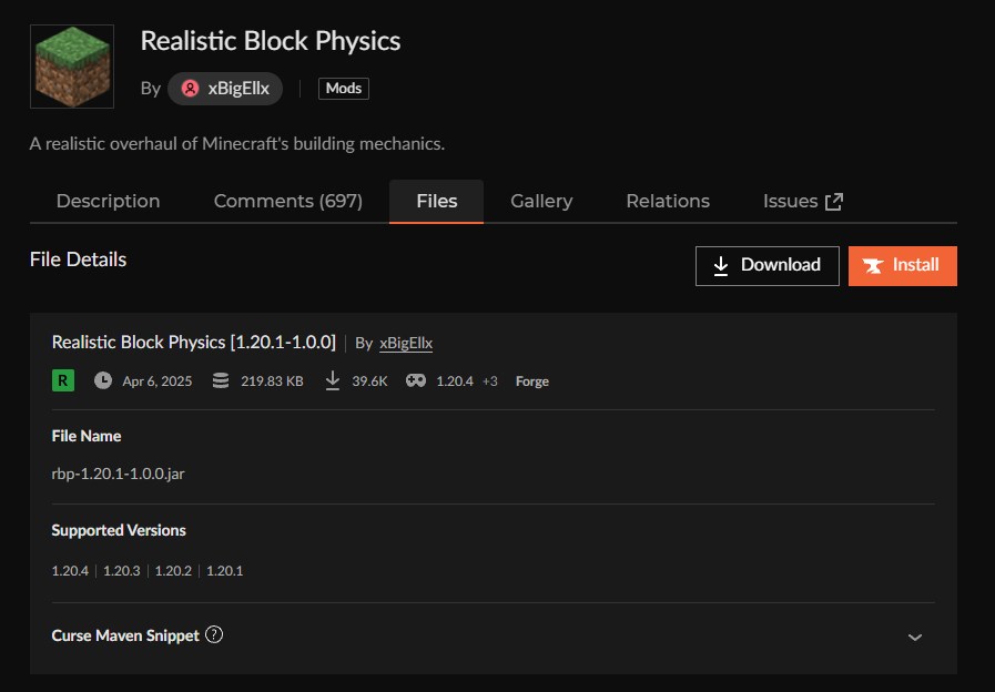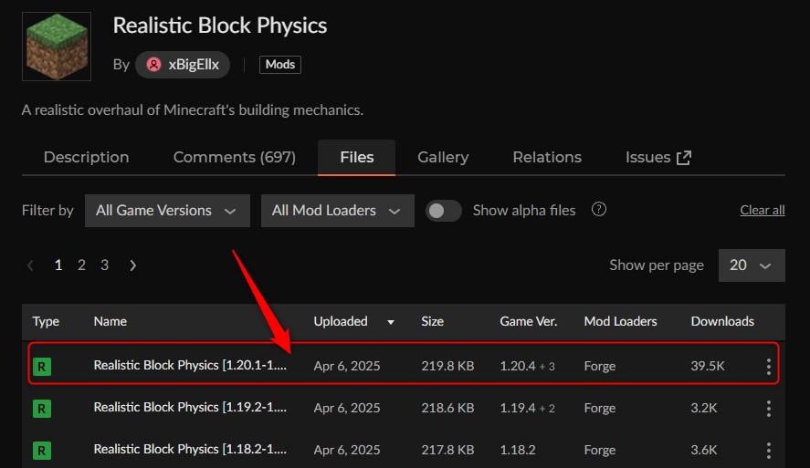 CurseForgeの「Realistic Block Physics」ページにアクセスして、バージョンを選択します。