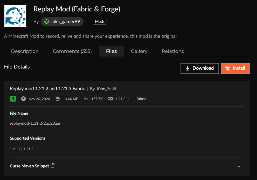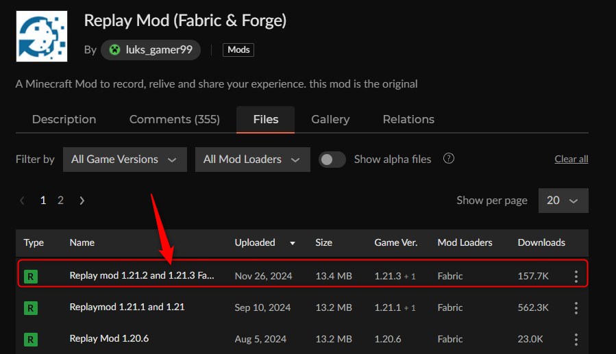 CurseForgeの「Replay Mod (Fabric & Forge)」ページにアクセスして、バージョンを選択します。