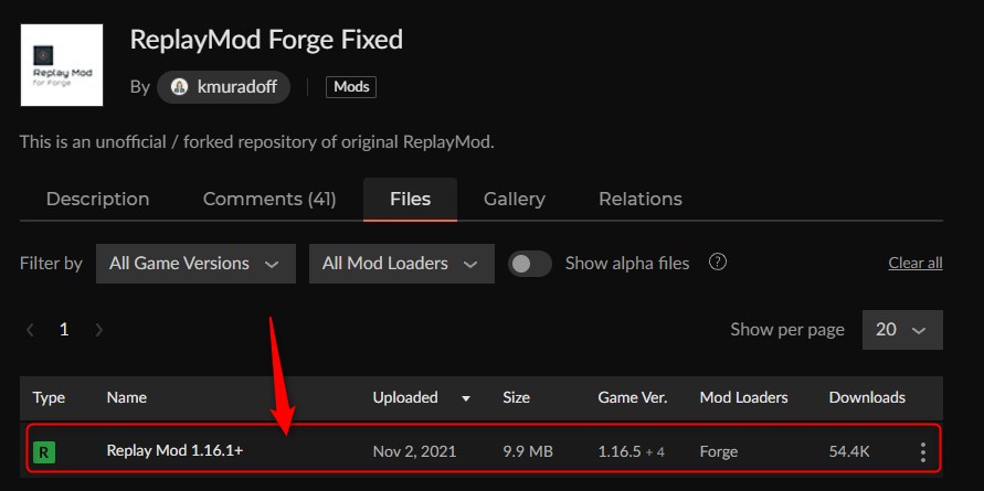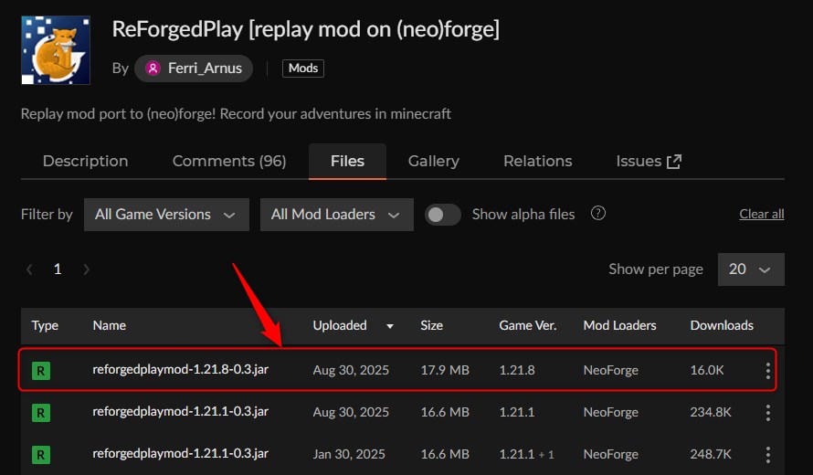 CurseForgeの「ReplayMod Forge Fixed」ページにアクセスして、バージョンを選択します。
