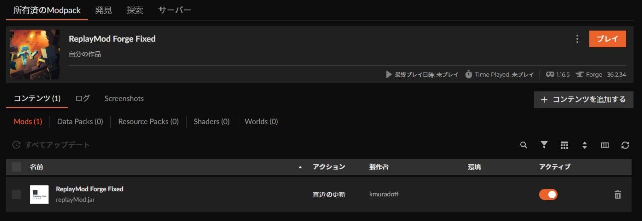 1.16.5のForge環境でリプレイMODを安定して使用したい方は、「ReplayMod Forge Fixed」をインストールしてみましょう。