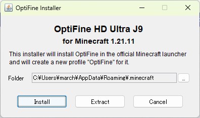 ダウンロードした「Optifine」をダブルクリックしてインストーラーを開き、「Install」をクリックします。