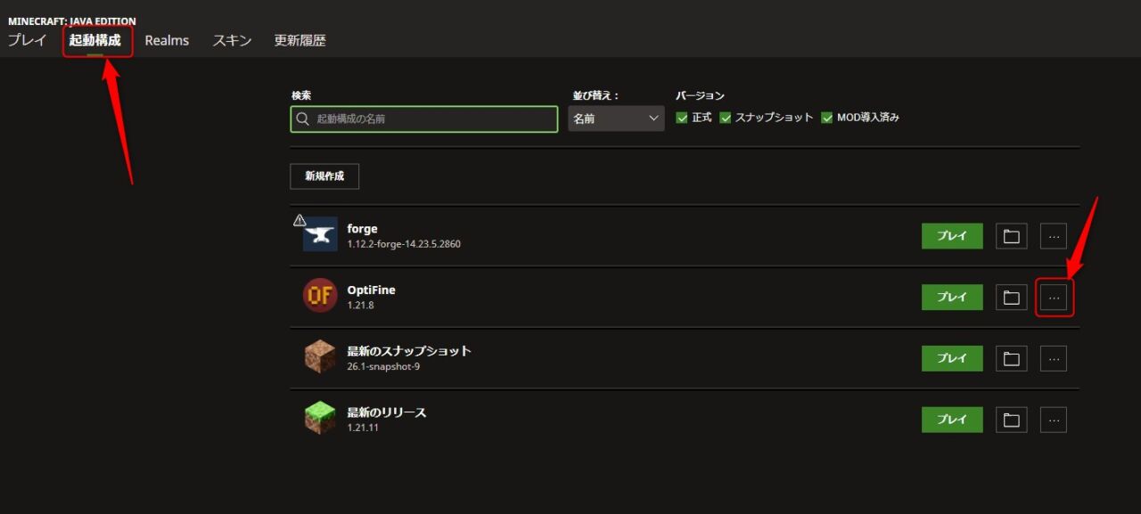 上記の場合だと、1.21.8で起動構成を変更してプレイします。