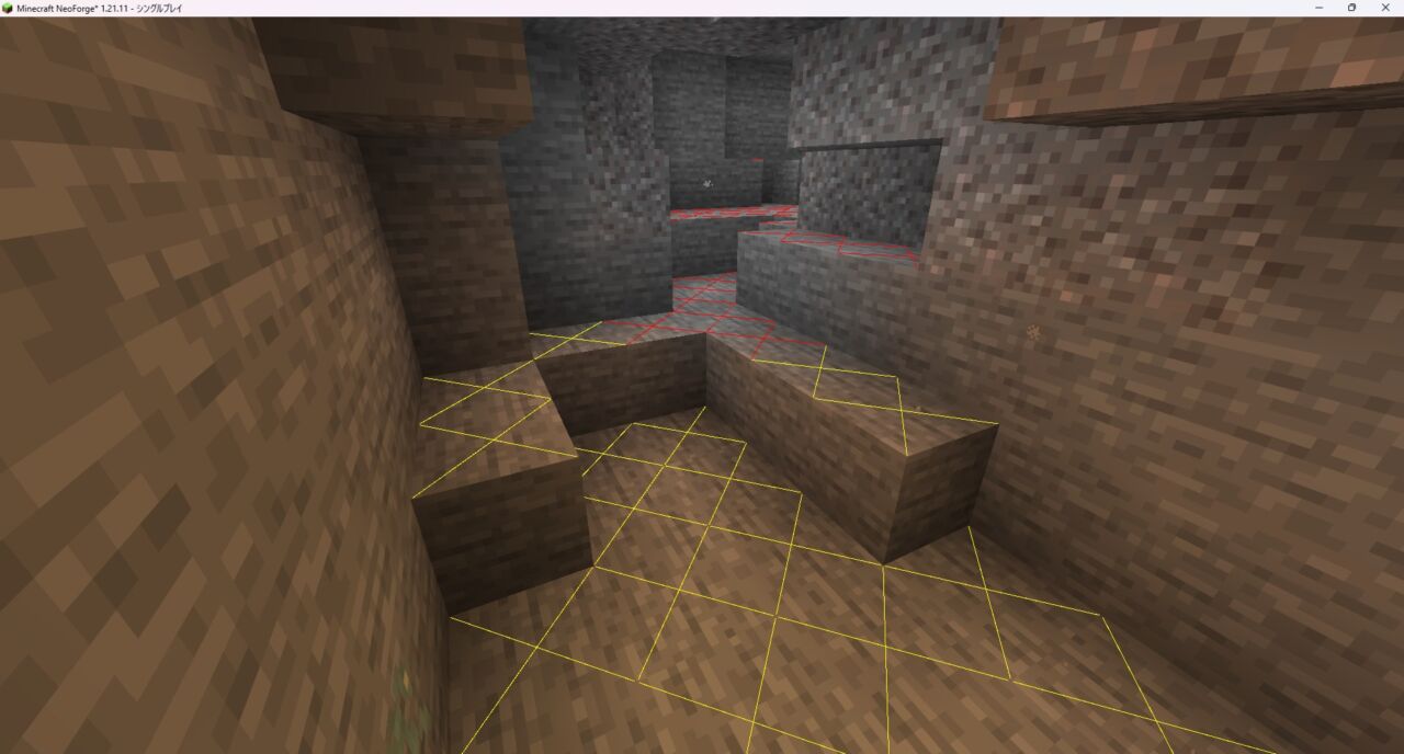 F7キーを押すと、夜間にモブがスポーンする場所には黄色の印が表示され、洞窟内など昼夜を問わず常にスポーンする場所には赤色の印が地面に表示されます。
