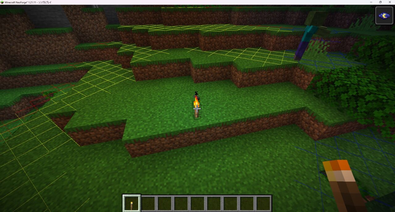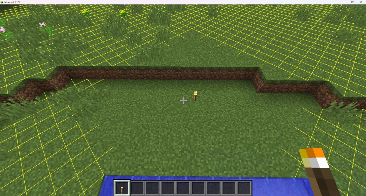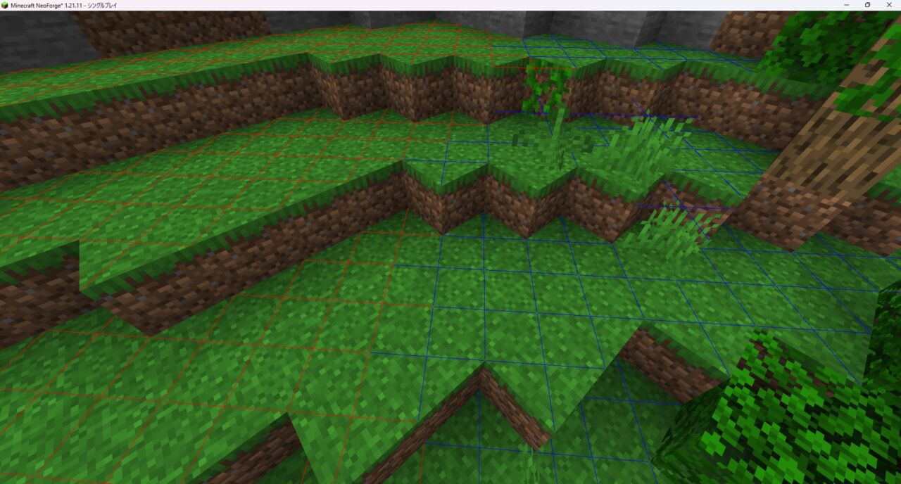 - チャンク境界オーバーレイ: F9キーを押すと、チャンクの境界線をゲーム内に赤・黄色・緑のラインで表示できます。トラップタワーの建設やチャンクロードの管理など、チャンク単位の作業が大幅に効率化されます。