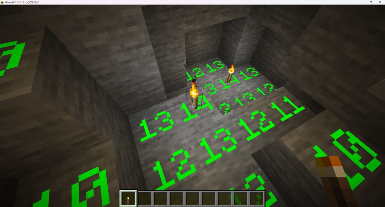 ゲームメニューの「Mods」→「MoreOverlays」→「Config」→「Light Overlay」から「Use Number Overlay」を「Enabled」にすると、実際の光源レベル(0〜15)が表示されます。
