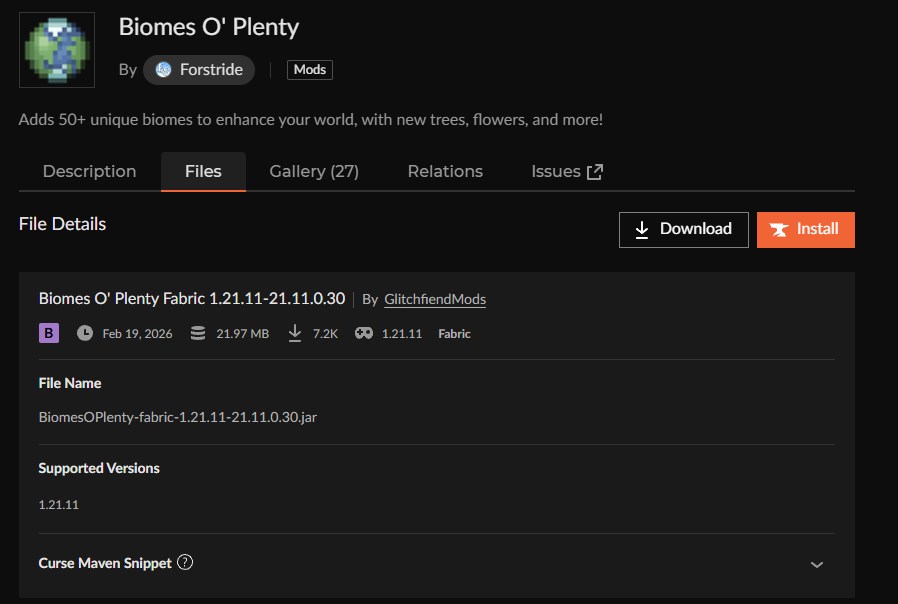 | 1:Biomes O’ Plenty | ・全ての地形生成MODの王道となる存在で、ファンタジーから現実的なものまで圧倒的な数のバイオームを追加します。 ・独自の植物や木材ブロックも大量に追加され、建築の幅が格段に広がります。 | 1.7.10~1.21.11 |