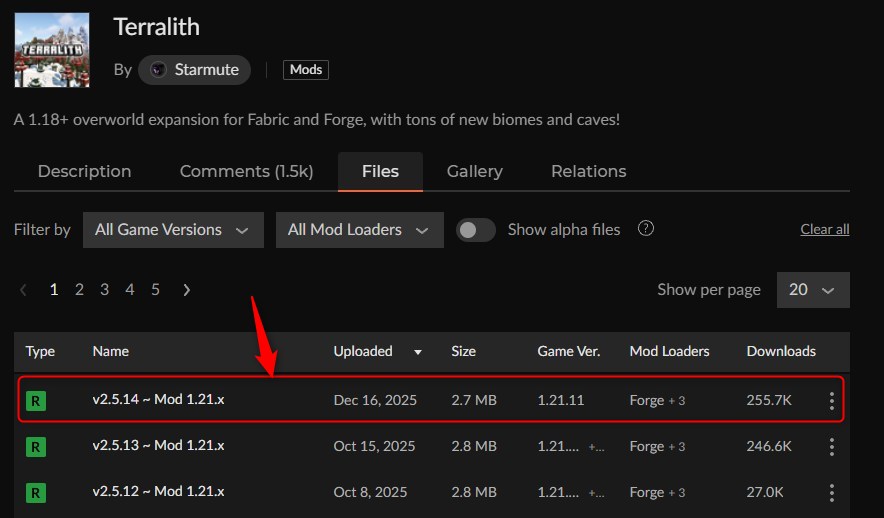 | 2:Terralith | ・1.20.1などの新しい環境で絶大な人気を誇る、バニラブロックのみを使用した新世代の地形生成MODです。 ・新しいブロックを追加しないため動作が軽く、バニラの雰囲気を保ちつつ壮大な絶景を作り出します。 | 1.17~1.21.11 |