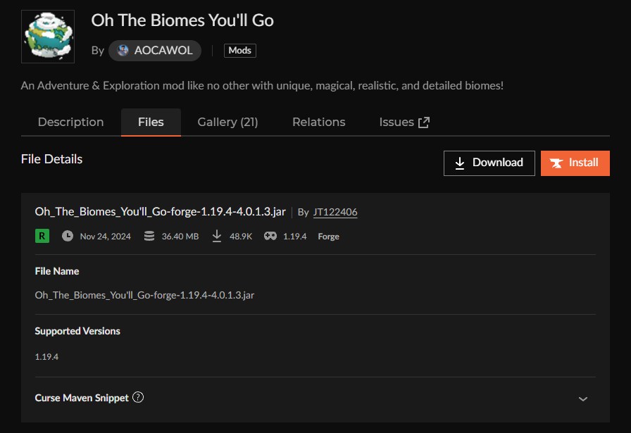 地形生成MOD「Oh The Biomes You’ll Go」の入れ方