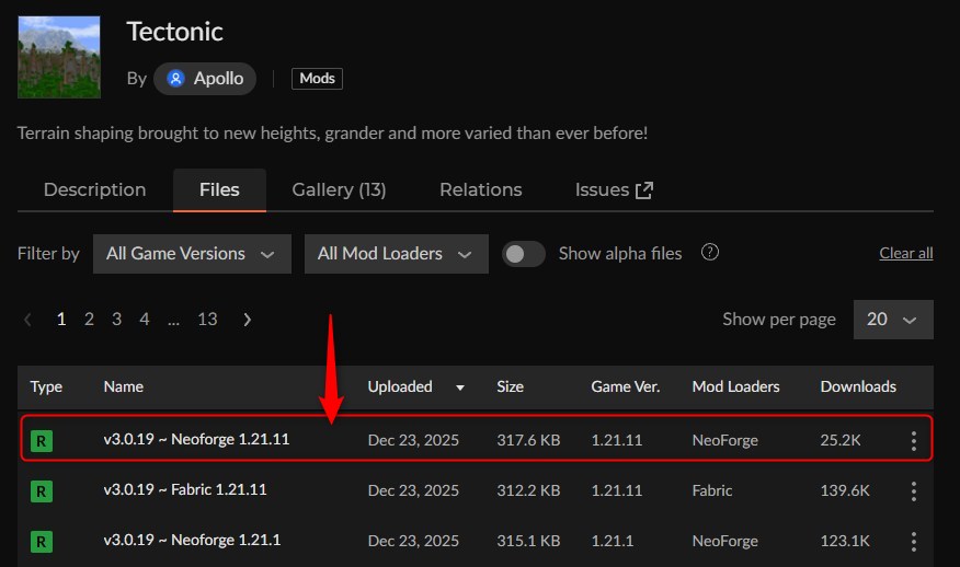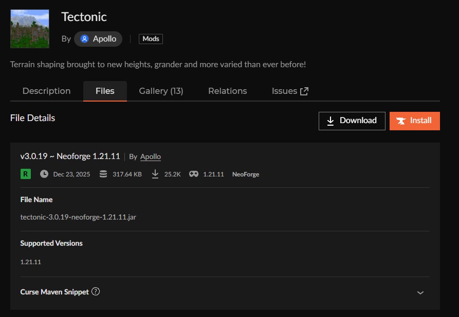 | 4:Tectonic | ・バイオームの種類ではなく、山脈の高さや川の太さといった「地形の起伏」をダイナミックにするMODです。 ・「Terralith」などの他MODと一緒に導入して、自然のスケール感を極限まで引き上げるのがトレンドです。 | 1.18.2~1.21.11 |