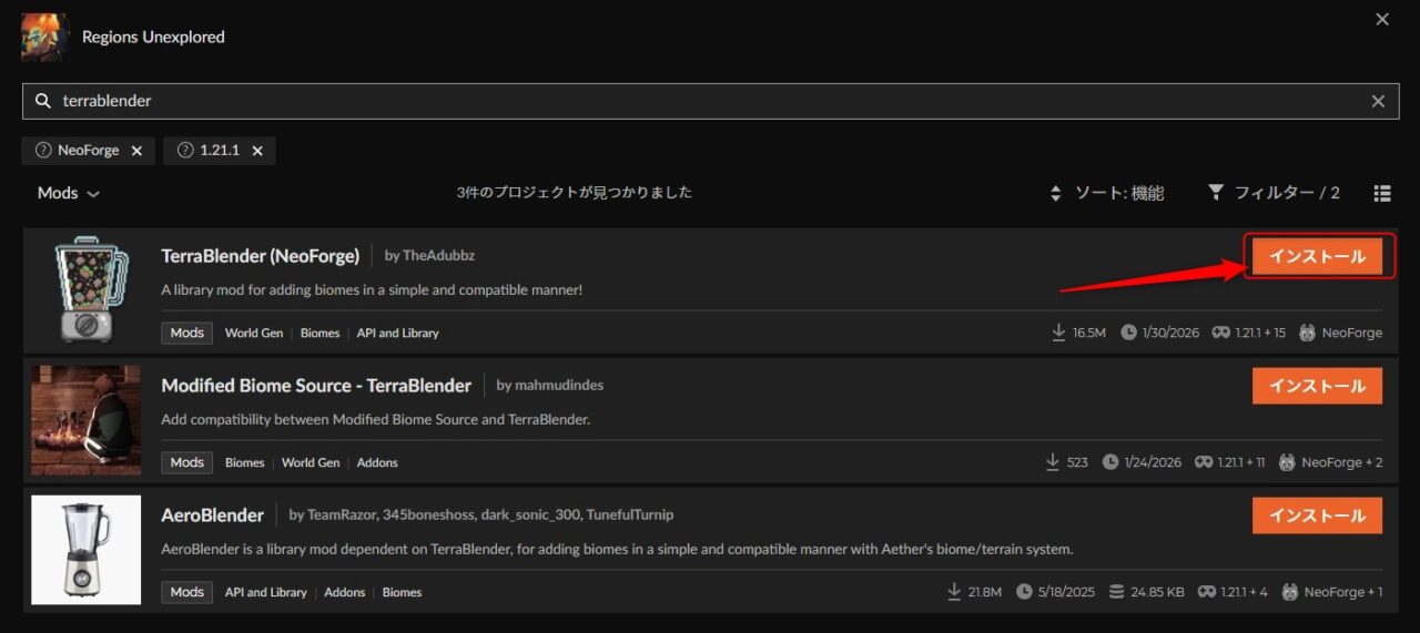 地形生成MOD「Regions Unexplored」の入れ方を3ステップで紹介します。