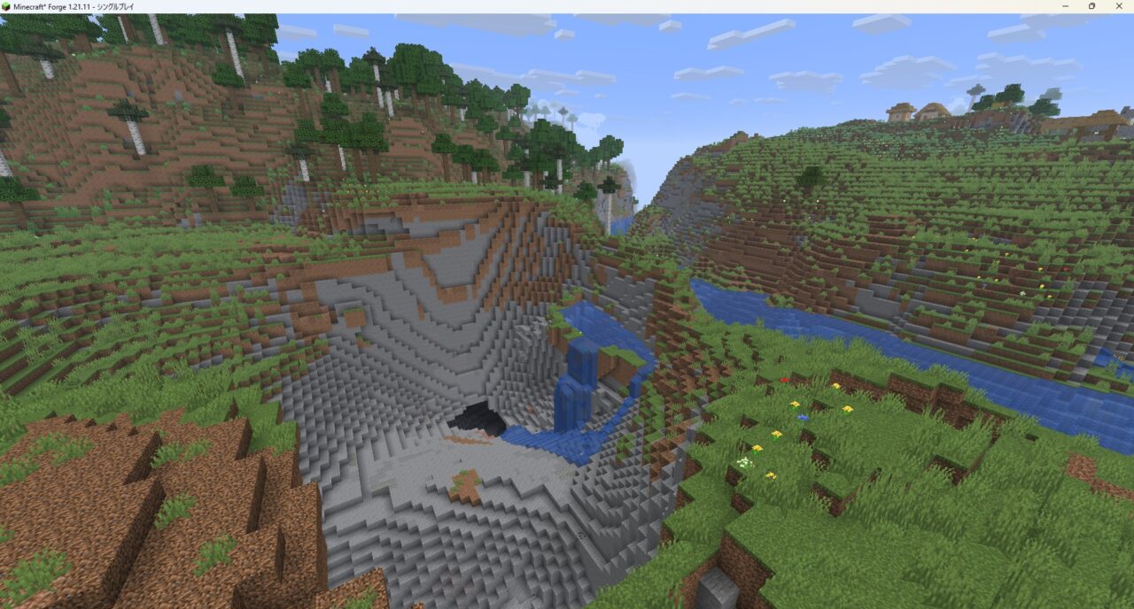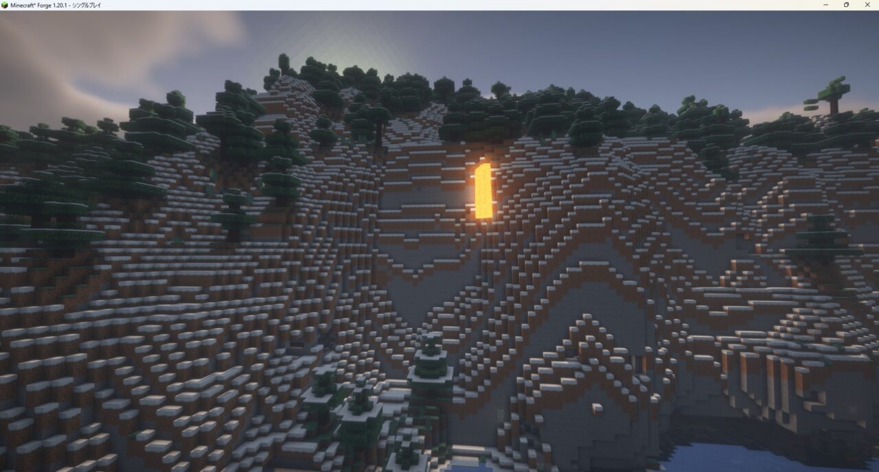 マイクラで新しいワールドを作成し、巨大な渓谷やイエローストーンのような地形が生成されていたら導入完了です。