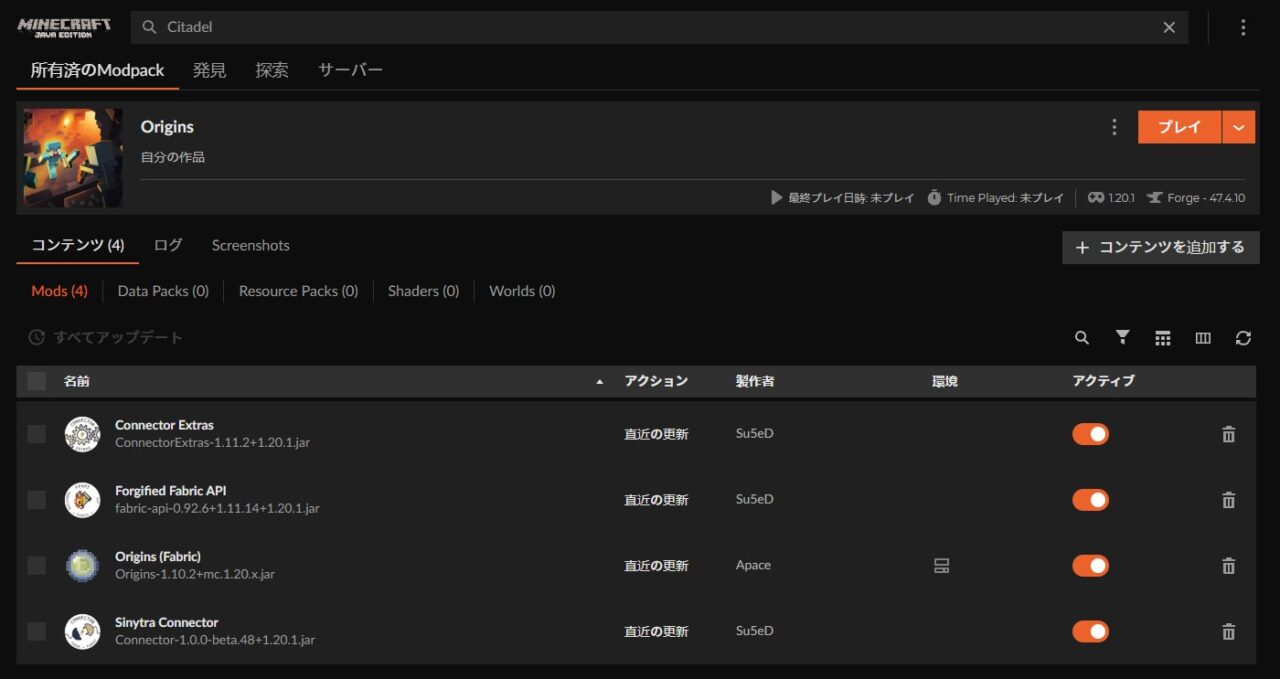 「プレイ」をクリックしてランチャーを起動。マイクラのMOD欄に「Origins」があるか確認しましょう。