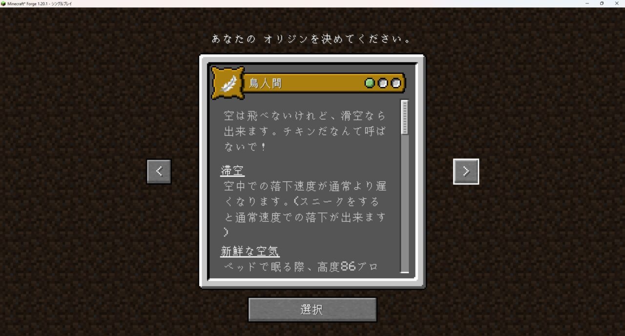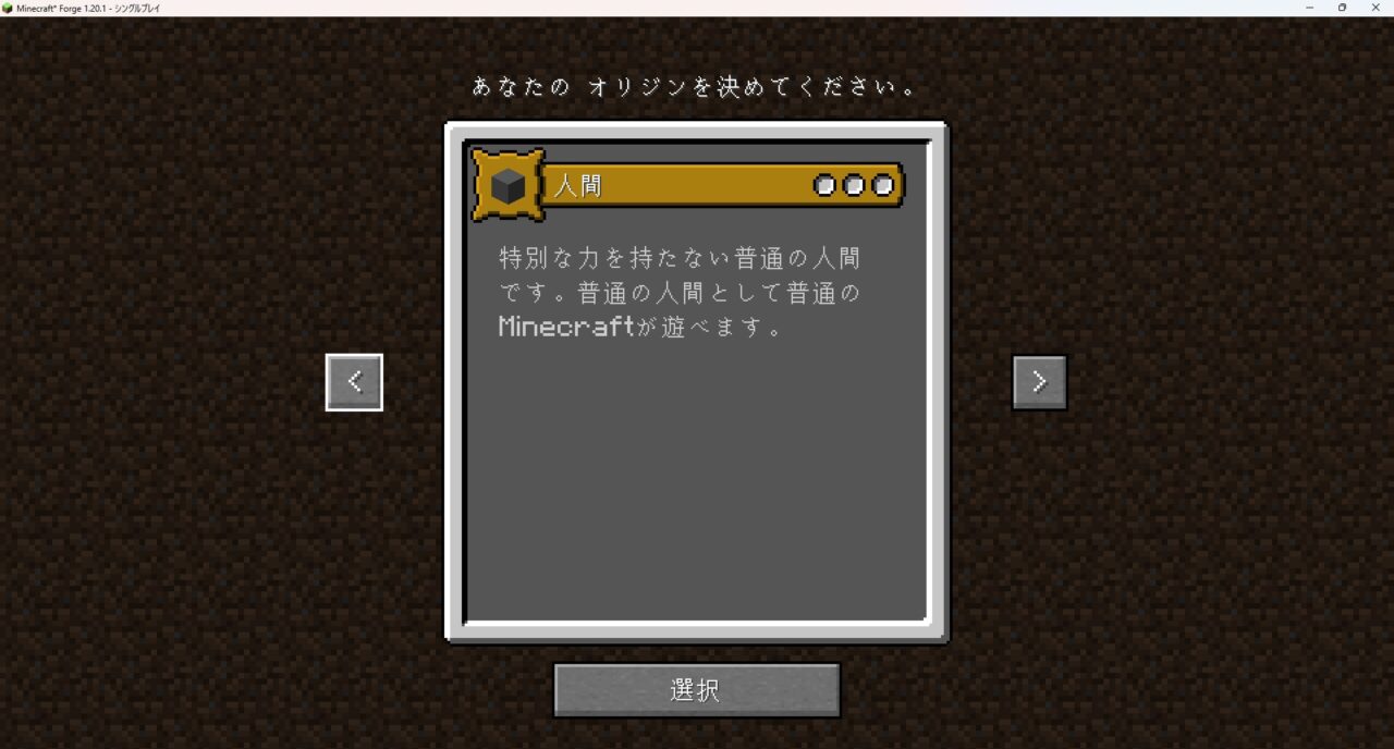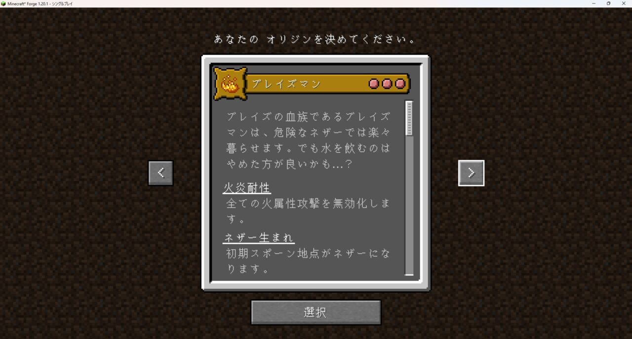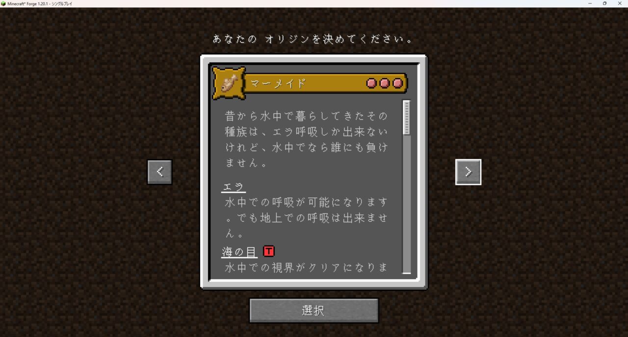 これはゲーム開始時に自分の「種族」を選択し、その姿と能力でサバイバルを楽しむMODです。