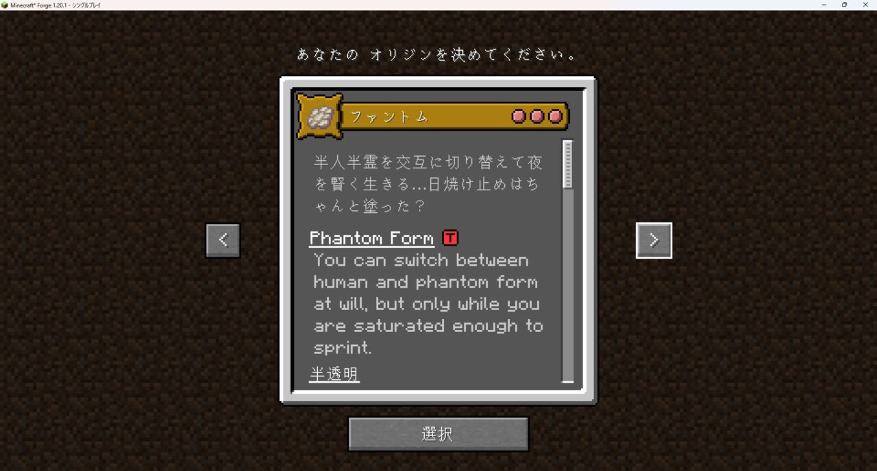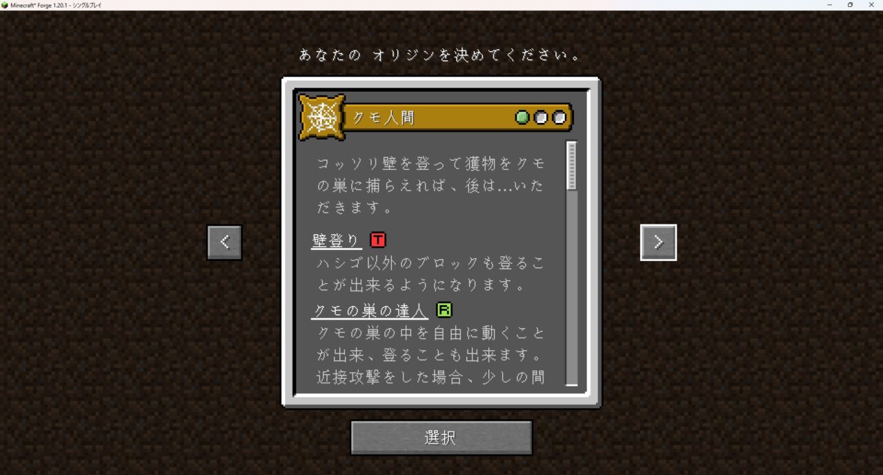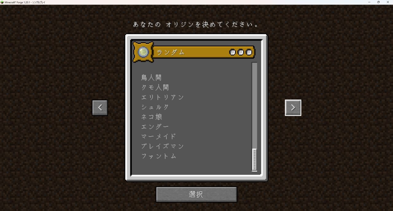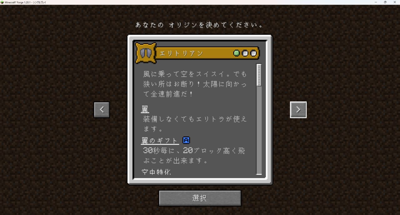 これはゲーム開始時に自分の「種族」を選択し、その姿と能力でサバイバルを楽しむMODです。