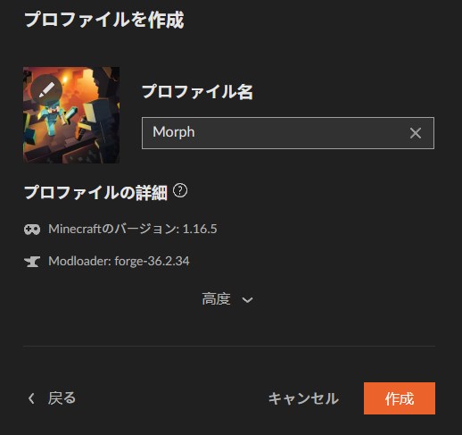 「プレイ」をクリックしてランチャーを起動。マイクラのMOD欄に「Morph」があるか確認しましょう。