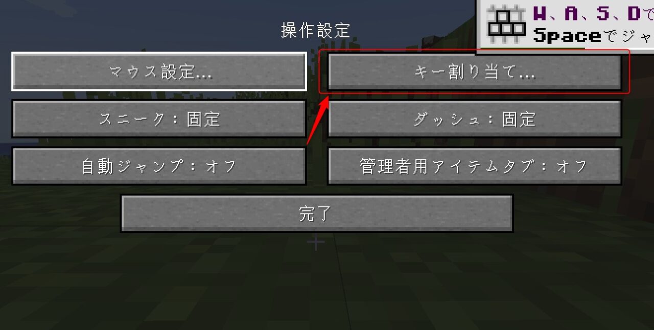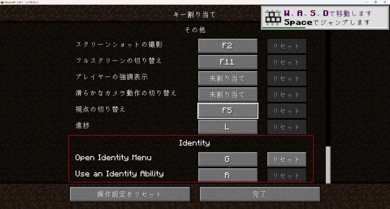 マイクラの「設定」→「操作設定」→「キーの割り当て」で「Identity」のメニューを開きます。