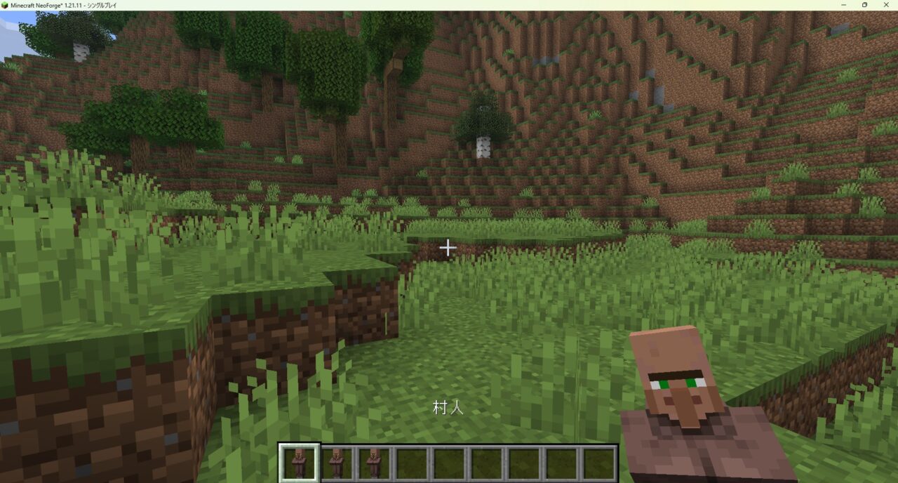 マイクラをプレイして、スニーク(しゃがみ)状態で村人を右クリックし、村人がアイテムとしてインベントリに入れば導入完了です。