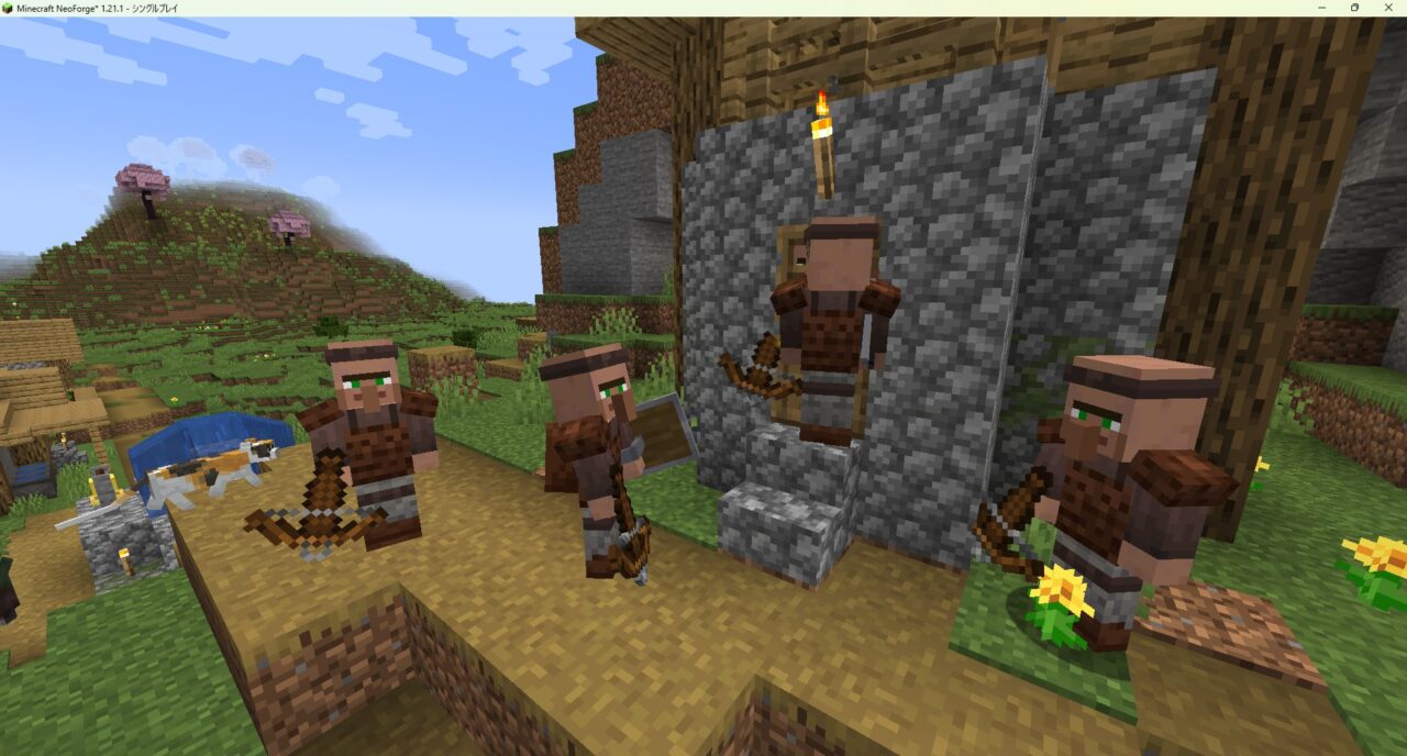 - 警備員村人のスポーン: 武器を持ったガード村人が自然発生し、村に近づく敵対モブを自動で攻撃してくれます。